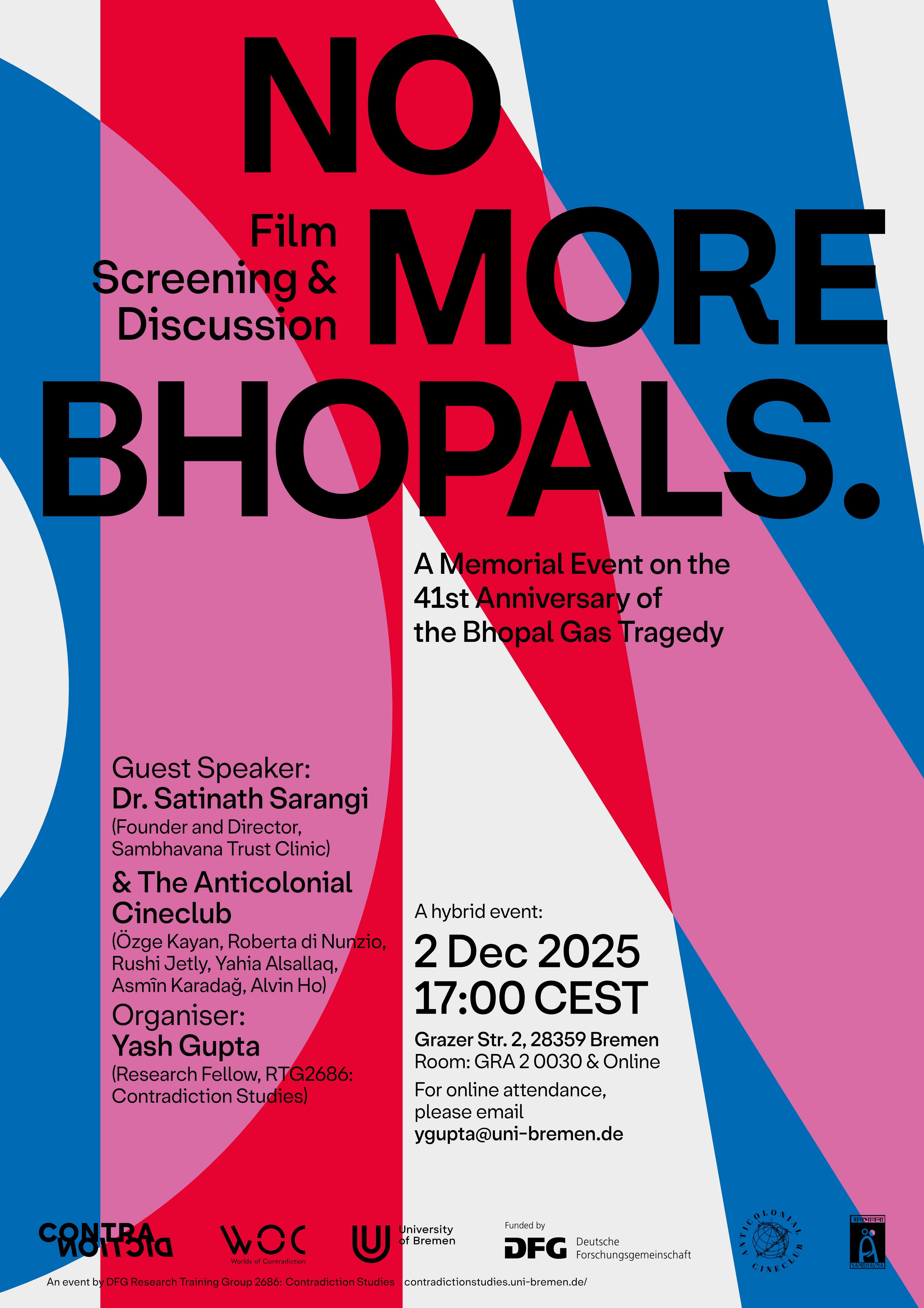 A post-screening discussion will be held with Dr. Satinath Sarangi, Founder and Director of the Sambhavana Trust Clinic, a local community organisation providing care to the event’s survivors. The discussion will be moderated by and Yash Gupta, a second-generation survivor of the tragedy, and the Anticolonial Cineclub of the University of Münster. This event marks the third in the annual Bhopal Gas Tragedy Memorial Screenings, previously organized at the University of Münster, and continues the effort to foster spaces of remembrance and reflection through film and dialogue.